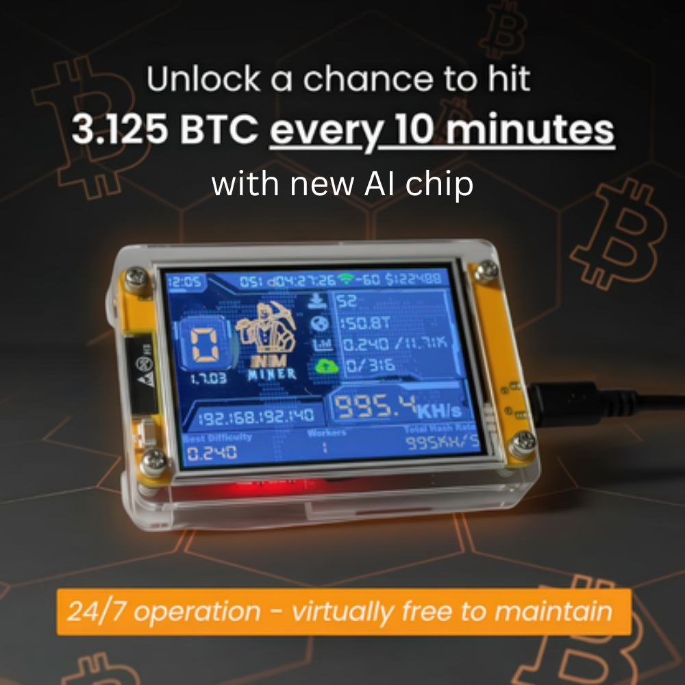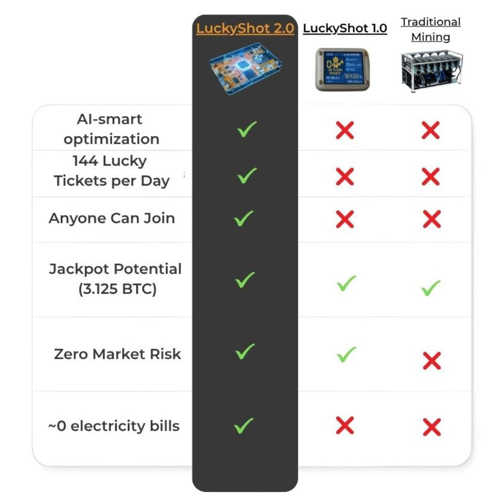The LuckyShot 2.0 Miner is a next-generation, AI-powered crypto gadget that gives you a fresh “lottery ticket” every 10 minutes for the full Bitcoin block reward (3.125 BTC, worth ~$350,000 at current prices).